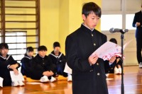 3年生からは、代表生徒からのお礼の言葉の後、体育の授業で作成した、感謝の意味を込...