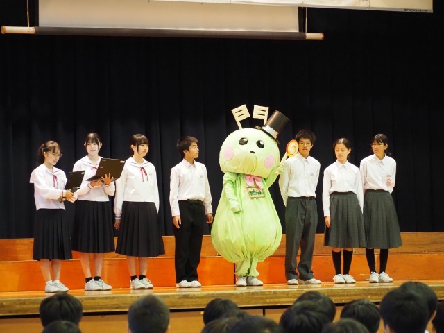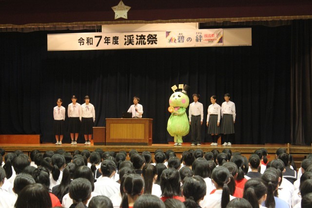 開会式及びオープニングセレモニーの様子です。生徒会が考案した門池中公式キャラクターの「かどりゅん」も登場しています。