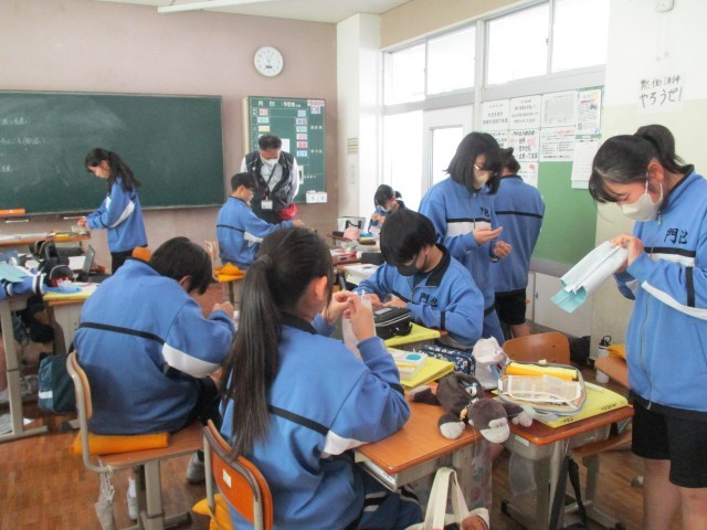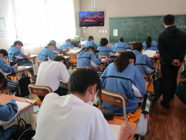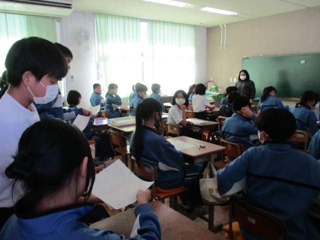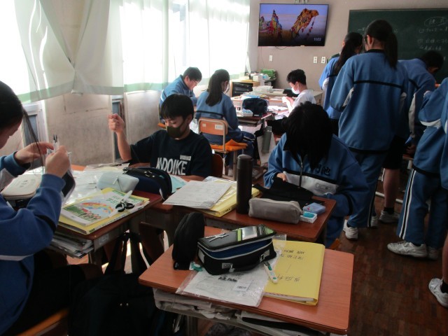1A国語 単元テストがちょうど終わり、後ろからテストを回収しているところでした。