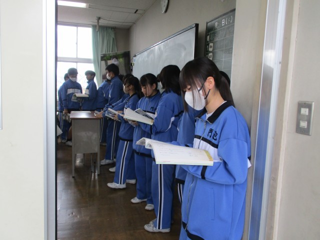2A国語 平家物語の暗唱テストを行いました。次の順番の生徒も教室の中で列を作り、練習をしていました。