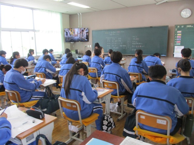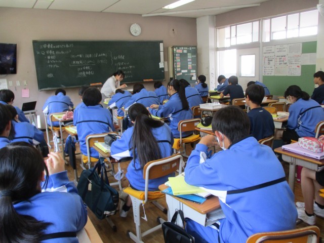 2B社会 地形図の見方の学習です。沼津市の地形図を見ながら、川を水色で塗るなどし、沼津市の地形に関するイメージをつかみました。