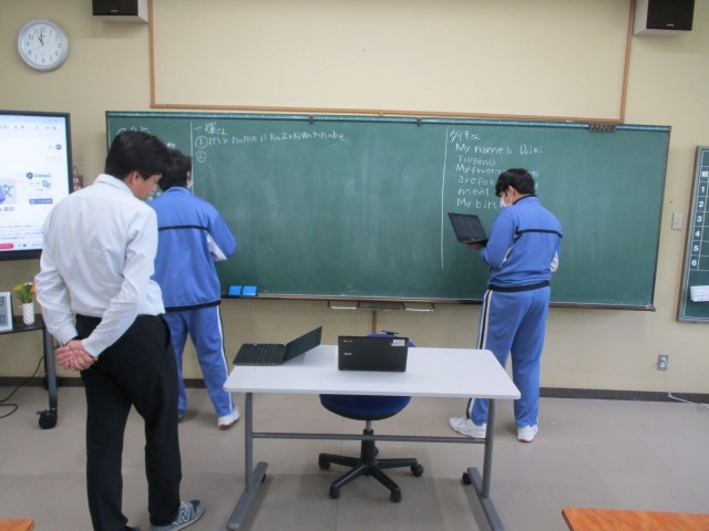 1組は朝の会のプログラムを先生と一緒に作って、それを書いてまとめました。2組は英語です。英語による自己紹介の文を黒板に書きました。