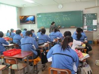A組は数学です。どんな三角形でも角の和が180度になるのはなぜだろうかを考え話し合いました。B組は国語です。「類義語」「反対語」「上位語」「下位語」などを結び、「言葉の樹」を書きました。