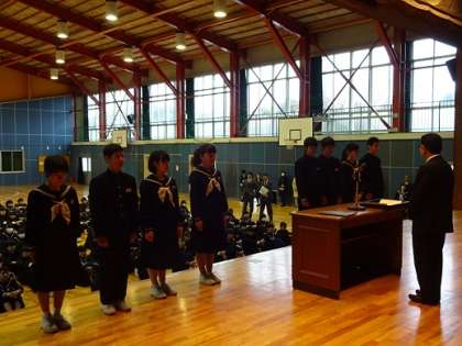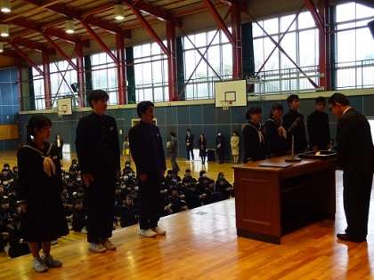 生徒会長から、本部役員、専門委員長の名前を呼ばれ、校長先生から辞令を渡されました。