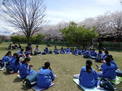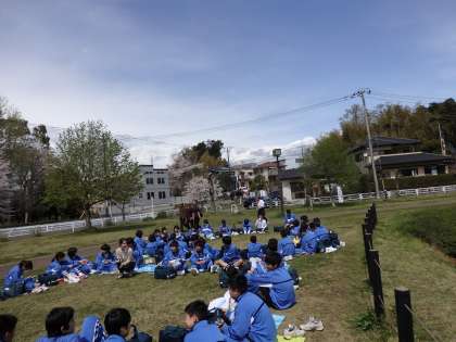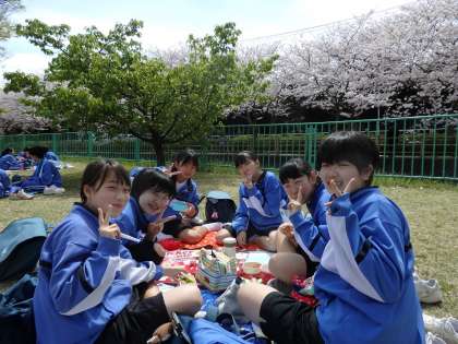 春らしい陽気の中、2年生が門池で昼食です。見て下さい、この嬉しそうな表情!