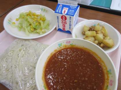ソフトめん  牛乳  ミートソース  ポテトとナッツのから揚げ  キャベツとコーンのサラダ