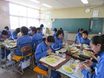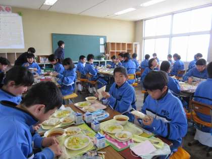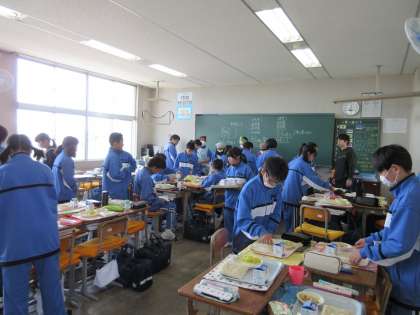 1年生の様子です。班で協力して配膳をしていました。