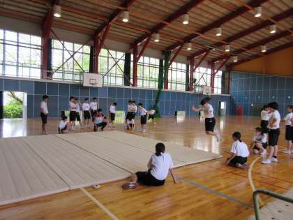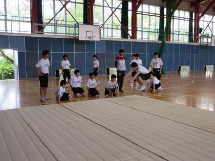 立ち幅跳びの練習と記録測定です。 係を分担して、互いに声を掛け合いながら行っていました。