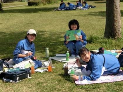 1年生は門池周辺で写生会を行いました。五月晴れの昼下がり、昼食後で少し疲れ気味の生徒もいましたが、多くの生徒が残り時間を気にしながら色付け作業に励んでいました。
