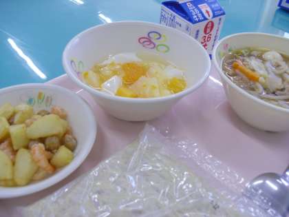 生徒も職員も大好きなタンメンとフルーツ杏仁豆腐です。初夏を思わせる気候に、冷たく冷えた杏仁豆腐はいつも以上に美味しく感じました。