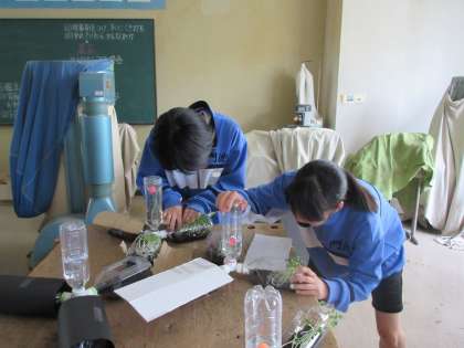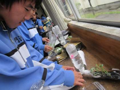 自分たちが育てた貝割れ大根を見つめる3年生、とてもかわいらしく優しい表情でした。