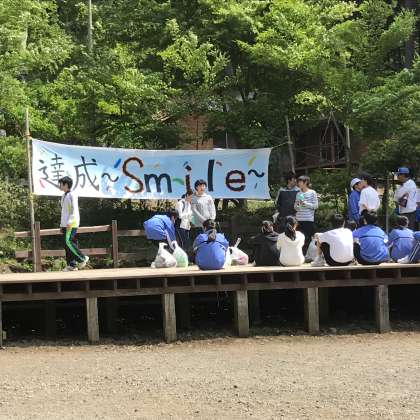 登山も無事終わり、紅葉台キャンプ場に着きました。早速、入所式です。キャンプ場の管理人さんに話しをしていただきました。そして、ついにスローガンの横断幕が掲げられました。