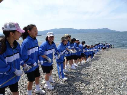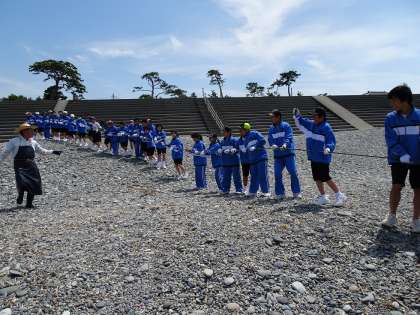 ゴールの千本浜に到着です。 網元の皆さんに教えていただきながら、網ひき体験です。