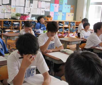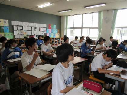 2年生 国語の授業です。文法、語尾の変化についての学習です。まずは「未然・連用・終止・連体・仮定・命令」と書いて、言えるように・・・。早口ことばのようで、苦戦していました。