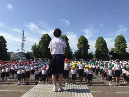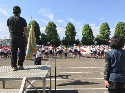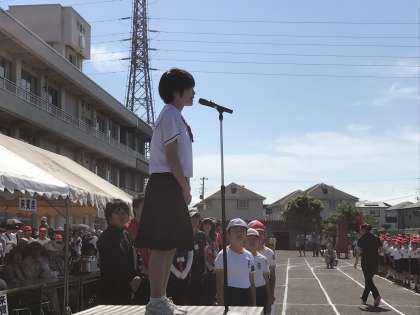 門池小運動会開会式で、生徒会長の佐藤未悠さんがあいさつをしました。