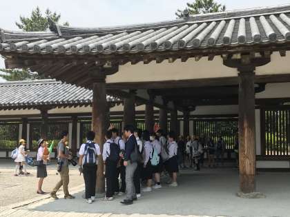 最初の見学地は法隆寺です。ガイドさんの話しを熱心に聞いています。