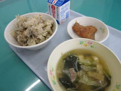 豚肉の炊き込みご飯 牛乳 カレイ米粉竜田揚げ うずらの卵と野菜のスープ