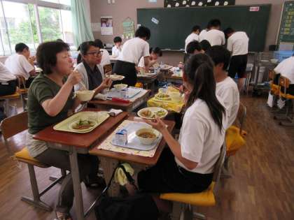 大人気の麺献立です。ALTのアナ先生と一緒に食も進みます。もちろん、おかわりも!