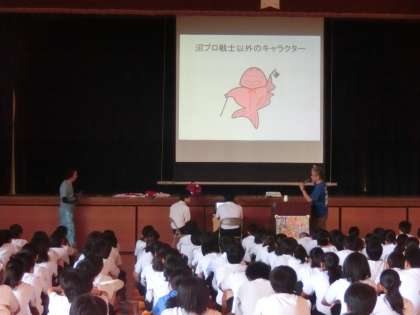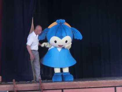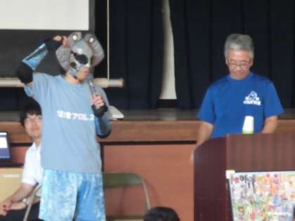 途中から、ゲストとして沼津プロレスのお魚戦士ヒラキングが登場。この覆面プロレスラーは実は、FM沼津などで活躍されている高橋裕一郎様でした。そして、ぐるめ街道のゆるキャラひものんも登場した。ひものんを誘導しているのは、時田先生。突然の時田先生の登場に大爆笑でした。