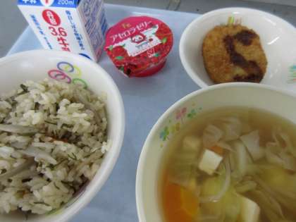 クープジューシー 牛乳 ツナコロッケ うずらの卵と野菜のスープ デザート(アセロラゼリー)