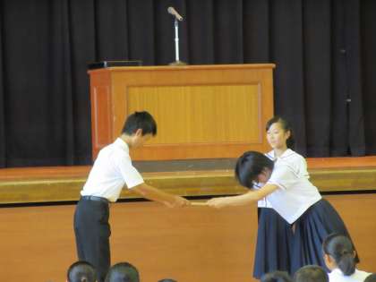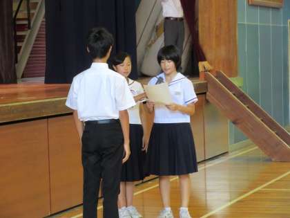 終業式に先立ち、大好評だった「ボキャモンバトル」の結果発表、表彰を行いました。みごと栄冠は3年A組に輝きました。