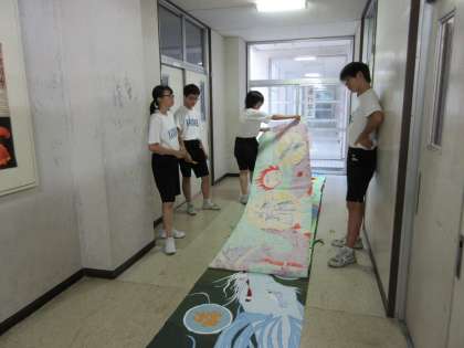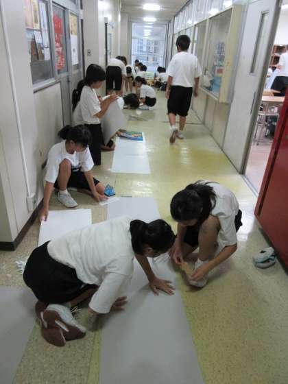 放課後は文化の部の係会です。展示担当はポスター掲示物の作成や美術部が作成した横断幕の寸法合わせをしていました。協力しながら、着々と準備が進んでいます。