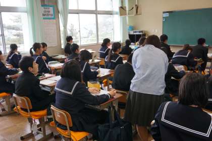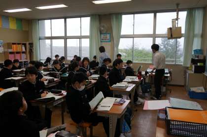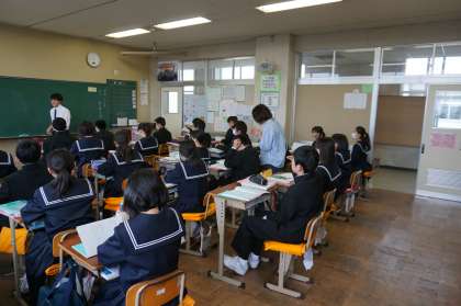 1年C組は国語の授業です。1年生国語、3年生数学、英語に週1回ティームティーチングという、2人の先生による授業を進めています。課題の意味が分からないで取り組めない、課題を間違って捉えている、どうしたらよいか分からないといった生徒に対して、個別に支援に入り、授業で活躍できるよう支援をしていきます。困っている生徒の表情や様子をみて、生徒に支援しています。支援を受けた生徒は安心して授業に取り組めています。