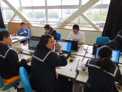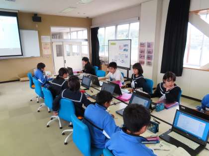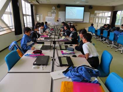 1Bは技術です。パソコン室でパソコンを使っての文字入力や線の引き方を勉強していました。最後の「保存」の方法に苦労していました。