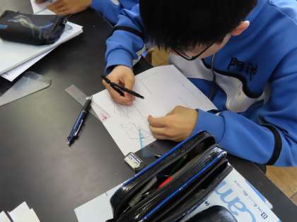 3Bは理科です。理科室で行っていました。平行四辺形を利用した力の合成について学習していました。