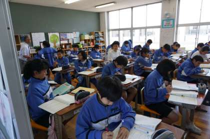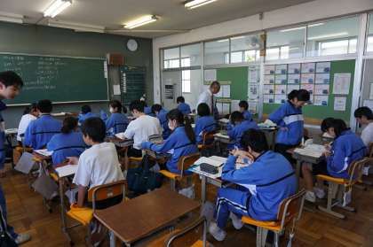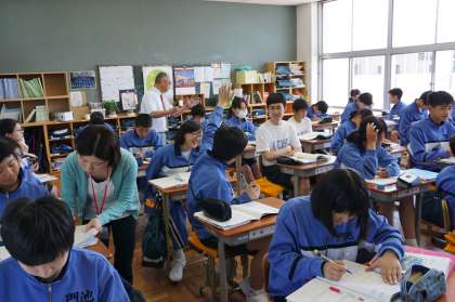 2年B組は数学です。整数の性質について、説明する問題を解いています。支援員の山開先生にも入っていただき、考え方について支援を進めています。また、お互いに教え合う場面も見られました。