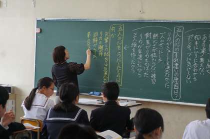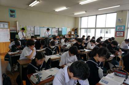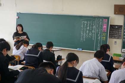 2年C組は主任の近藤先生による道徳の授業です。友だちと心のずれが起きたときにどうしていくのかを考えていく授業です。教育実習にきている2人も参観に来ていました。