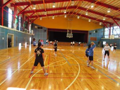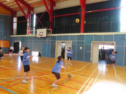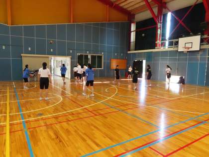 体育館に向かって入口付近で、バレー部が練習していました。女子はレシーブコンビネーションを行っていました。