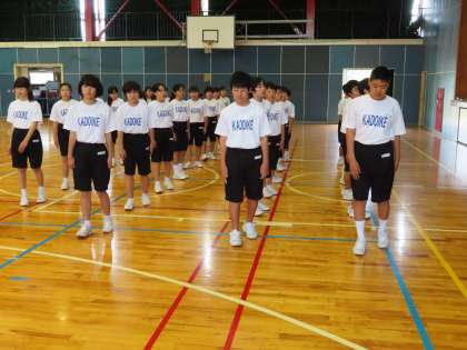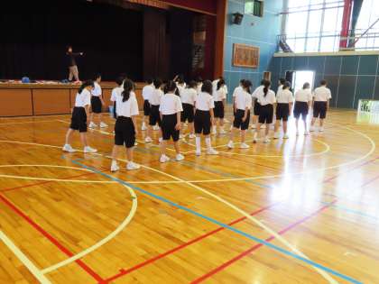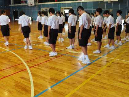 1Dは体育です。集団行動を行っています。「右向け右」足の運び方開き方丁寧に教えてもらっていました。
