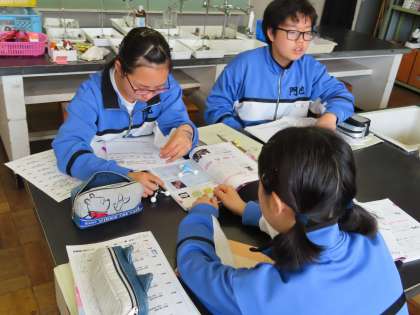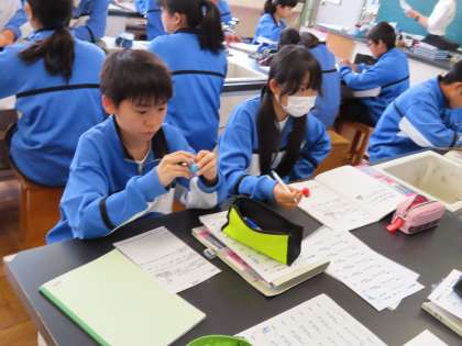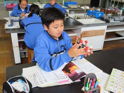 2Cは理科です。「化学式「分子とは、いくつかの原子がむすびついたもの」の授業でした。分子の模型を使って説明していました。