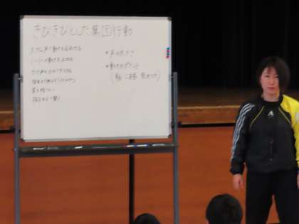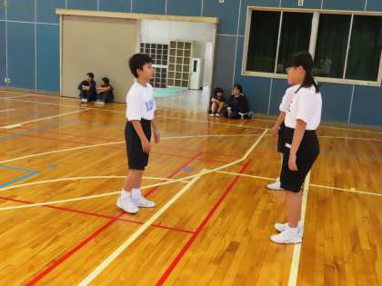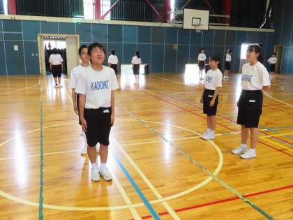 1Bは体育です。体育館で「集団行動の評価」に向けてグループごと練習をしています。大きな声で号令をかけていました。
