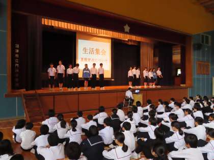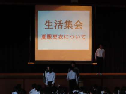 ただ今、夏服の更衣準備期間となっています。生活委員が中となって、夏服着用の注意事項を、劇風にしてわかりやすく説明していました。