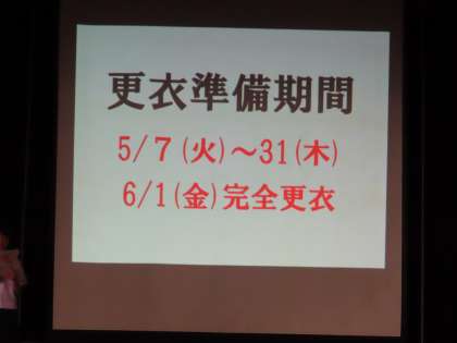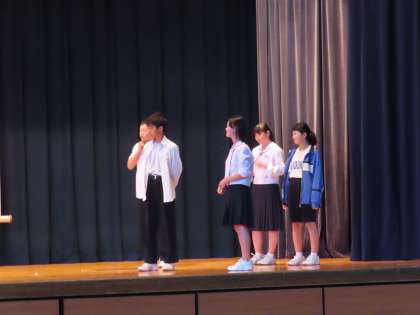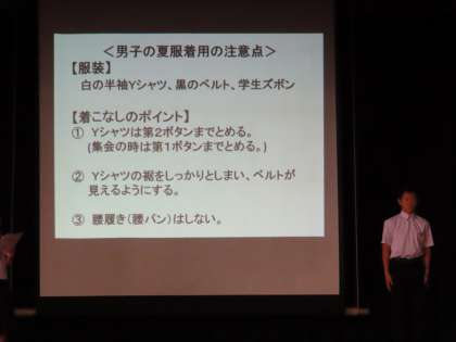 生活委員の堂々とした演技です。違反の服装の生徒と生活委員のやりとりです。プロジェクターを使って「文字」での説明もあります。