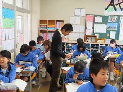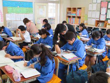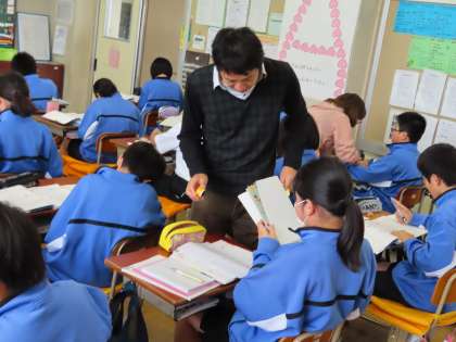 1Aは数学です。+-が入った乗法の計算をしていました。支援員の高橋さんが一緒に授業に参加してくださいました。授業に先生が2人いるのは心強いです。