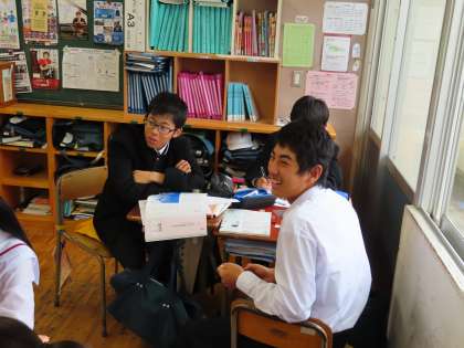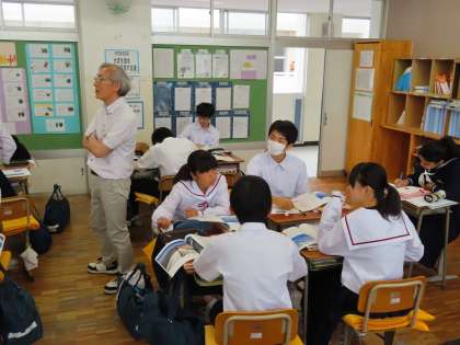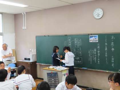 3Cは道徳です。瀧本先生の授業です。班ごとに意見をまとめて、黒板に書き足していました。その最中にも、新しい意見が出てきて、黒板に記入していました。