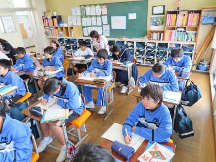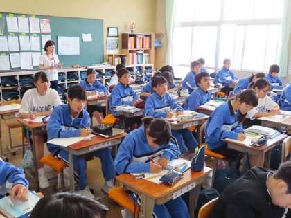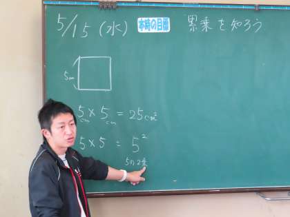 1Bは数学です。本日の目標は累乗を知ろうでした。毎回授業では、黒板に「今日の目標」と書かれています。何を勉強するのかが一目で分かります。