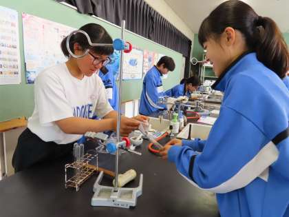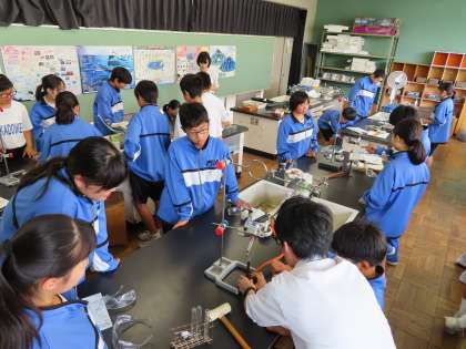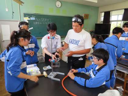 2Aは理科です。実験を行っています。「FeとSを混ぜて加熱するとどうなる」の実験をしていました。