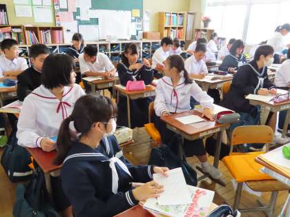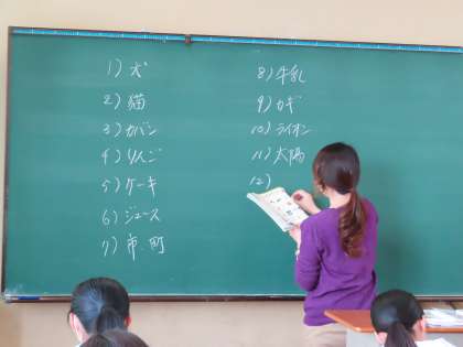 1Dは英語です。33個の英単語のテストをしていました。黒板の日本語を英単語に変えるテストです。いくつ覚えたでしょう?
