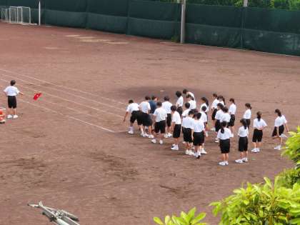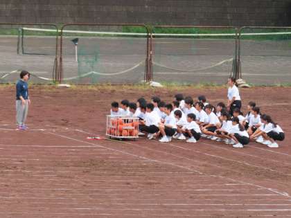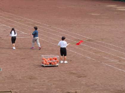 1Dは体育です。グランドで50m走とハンドボール投げを行っていました。校舎からの写真です。少し小さかったです。