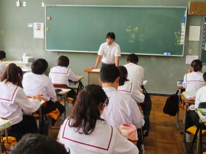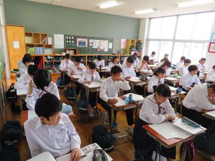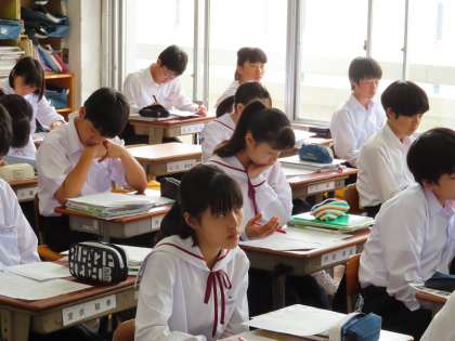 2Aは社会です。中間テストの解説をしながら直しをしていました。みんな開設を聞き逃さないようにしっかり聴いて直していました。
