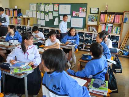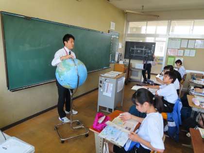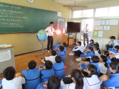 1Bは教育実習生の福岡先生の授業です。「経度の違いと気温の変化」です。大きな地球儀と明るいハロゲンライトを使って日当たりの様子を実験していました。色んな先生方が見学に見えました。