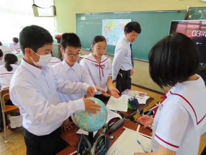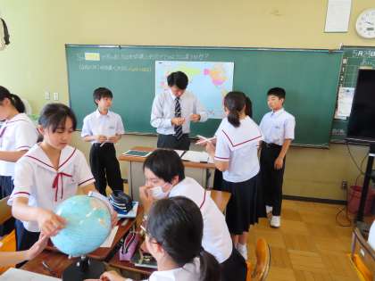 1Dは教育実習生の長澤先生の授業でした。地球儀と世界地図(メルカトル図法)の違いを学習しました。大人の私もなるほどと感心したことが多かったです。