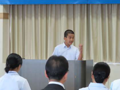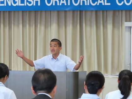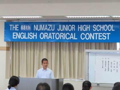 本校代表として3年C組の脇本優さんが出場しました。学校内でも生徒や先生方の前で練習を重ねていました。夏休みから「こつこつ」英文を作成しながら努力を重ねていました。本番は大きな声とジェスチャー、表情豊かに話すことができました。結果は、市内19名が参加しましたが、見事優勝することができました。おめでとうございます。次は東部大会に出場します。がんばって下さい。