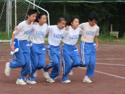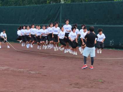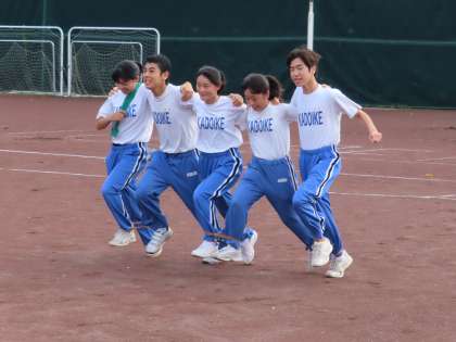 1年生の長縄は、それぞれ縄の回転スピードが違い特色が出ています。生徒たちの飛ぶペースに合わせているようです。とんだ後に走って移動してからまた飛ぶので、体力が必要となります。