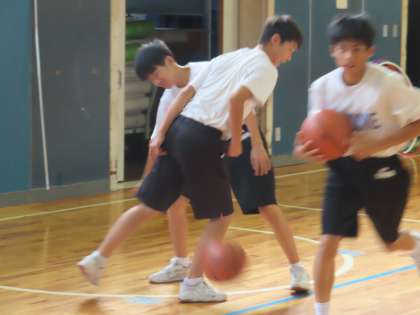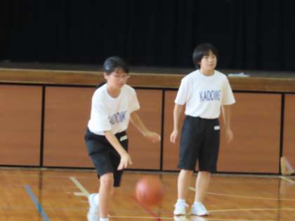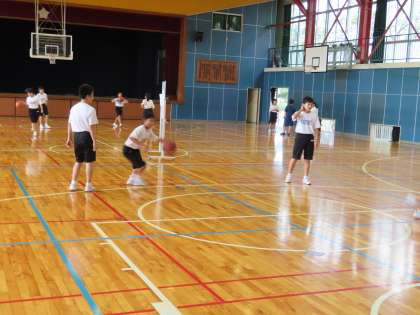 1Bはy体育です。バスケットボールを行っていました。ボールを受けてからピボットターンをしてからドリブルに移る練習をペアで行っていました。足の使い方が難しいです。