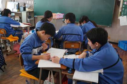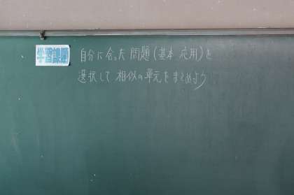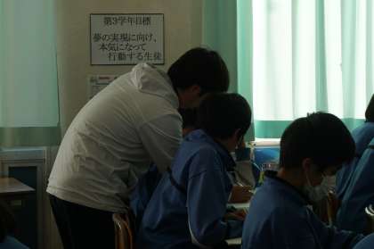 数学の授業です。相似を応用させた問題を解き合っています。とても真剣で前向きな雰囲気です。3年生らしさが出ていますね。